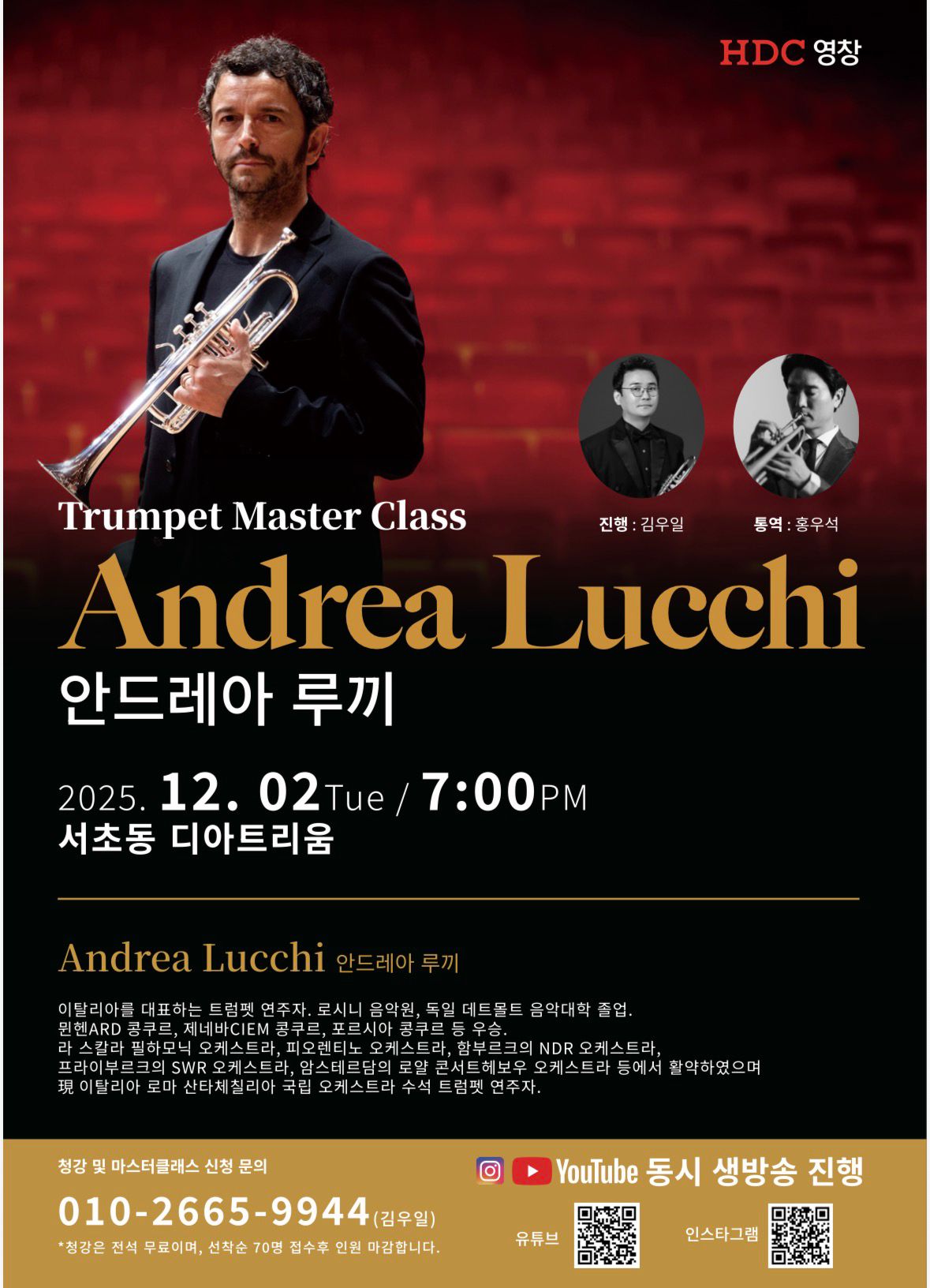 Andrea Lucchi è Prima Tromba dell’Orchestra Sinfonica Nazionale dell’Accademia di Santa Cecilia dal 2003. Stesso ruolo ha ricoperto nell’Orchestra Sinfonica Nazionale della RAI, e come ospite, nell’Orchestra Filarmonica della Scala, nell’Orchestra del Maggio Musicale Fiorentino, nell’Orchestra della NDR di Amburgo e nell'Orchestra del Royal Concertgebow di Amsterdam. Nel 1998 ha conseguito il diploma di Concertista, Konzertexamen, con il massimo dei voti e la lode presso la Hochschule für Musik di Detmold in Germania, sotto la guida del Prof. Max Sommerhalder. Vincitore di alcuni premi nazionali ed internazionali, si è distinto nei concorsi ARD di Monaco (1997), CIEM di Ginevra (1996), Porcia (1996), Ponchielli di Cremona (1991), Stresa (1984). Annovera, tra le incisioni radiotelevisive e discografiche, quella del Concerto per Tromba e Orchestra di H. Tomasi con l’Orchestra Sinfonica Nazionale della RAI (2003 - Editore: Video Radio Classics)